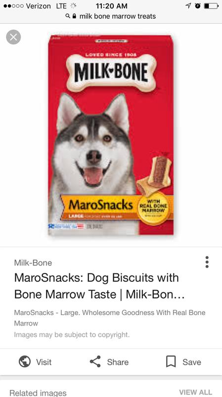Milk bone marosnacks dog treats with real bone marrow and calcium.